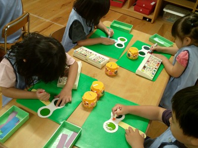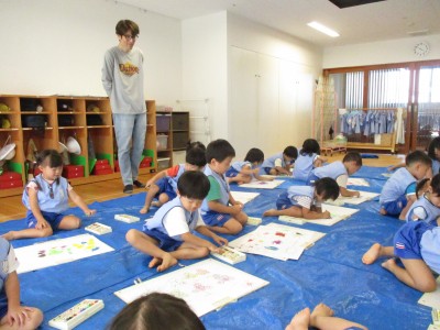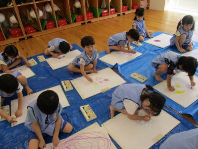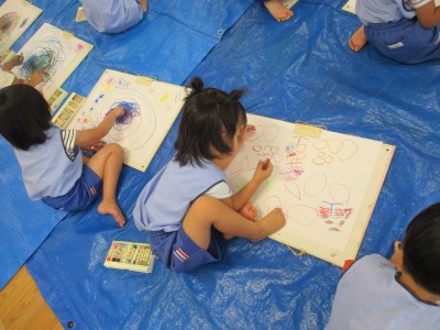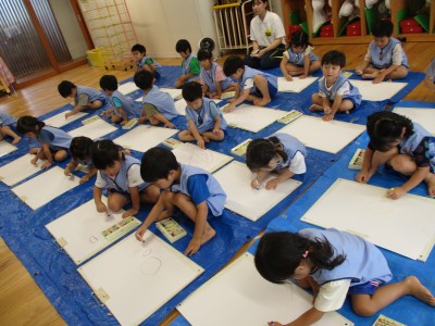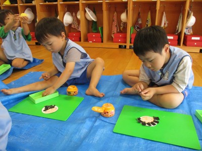 3歳児クラス運動会で使う応援旗用の顔を作りました。顔をクレパスで描いて、髪の毛は折り紙をちぎってのりで貼ります。細かい作業に子どもたちはとっても真剣な顔で作っています。