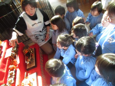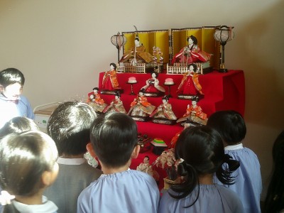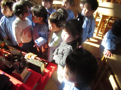 4歳児クラス火曜日。ひな人形の製作の前に、ランチルームの大きな雛飾りを観察しました(^^)