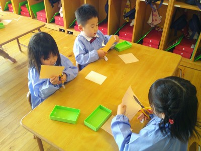 3歳児クラス①ハサミで切る。
