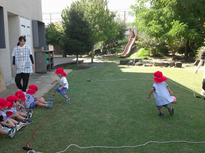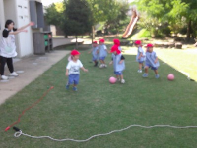 2歳児クラス今日は、園庭でボール転がしをしました!