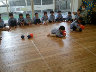 ボールが落ちてしまっても、もう一度お友達と力を合わせて挑戦です!