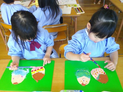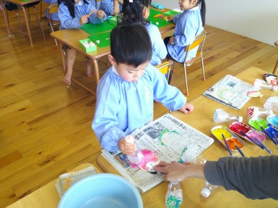 絵具を塗ってスタンプするときには、色が混ざっていく様子を楽しんでいて、完成を見せると嬉しそうな表情を浮かべていました。絵具の色の選び方や分量、スタンプの仕方で色が違い、一人ひとりの個性があふれる作品となりました(^^♪持ち帰る日を楽しみにしていてください。