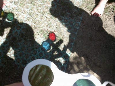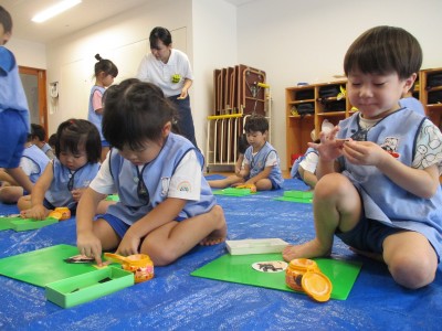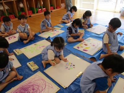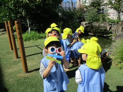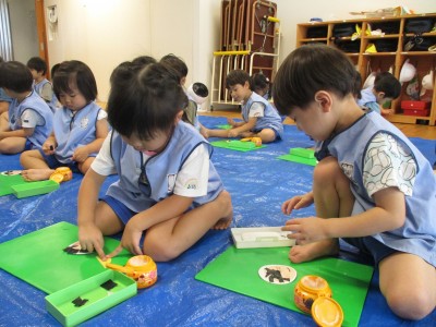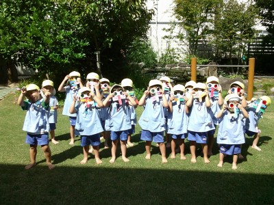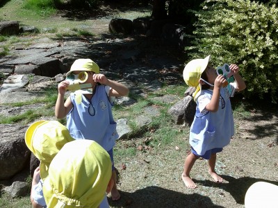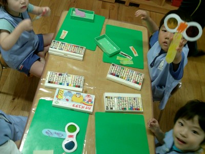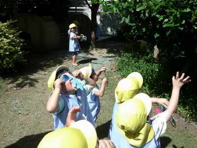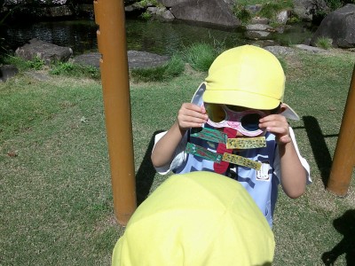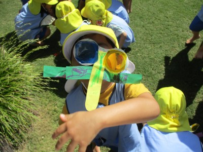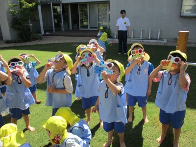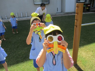 3歳児クラス今日は先日作ったとんぼのめがねで園庭に出てさっそく遊びました!子どもたちは大興奮!!みんな自分で作っためがねをもっていろんな物をのぞきます「あっ!ちょうちょ!」「あっちいこ~」「わ~!いろがかわった!」などなどとっても楽しそうでした。途中で地面にセロハンの色が写っていることに気が付くと「みてみて~」とまたまた大興奮でした!