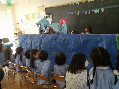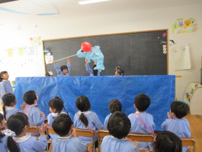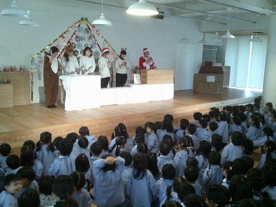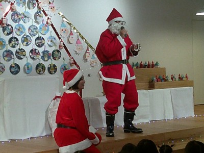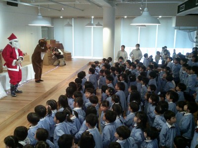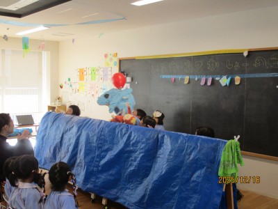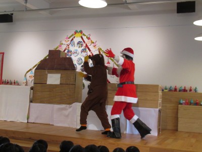 先生からの出し物は、パペットシアター『あわてんぼうのサンタクロース』と、合奏『きよしこの夜』です。
