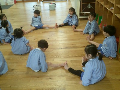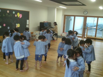 ぐりとぐらの大型絵本を見たり、みんなでリトミックをして身体を動かしたり…