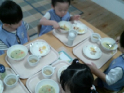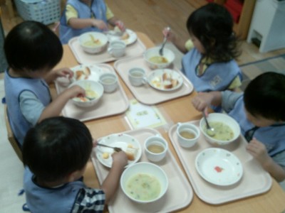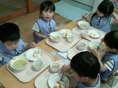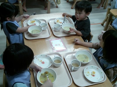 2歳児クラス毎日登園すると、今日の給食は何かな?と楽しみにする子ども達!