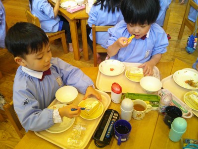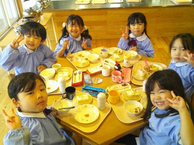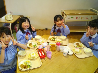 たくさん遊んだので、給食をもりもりと食べるあかつき組の子どもたちでした(*^^*)