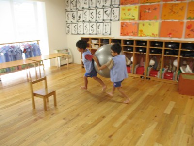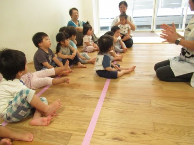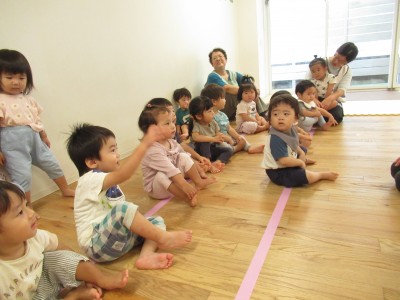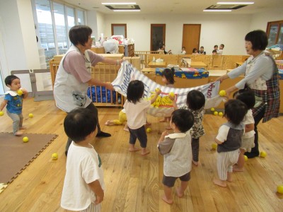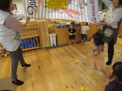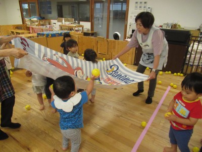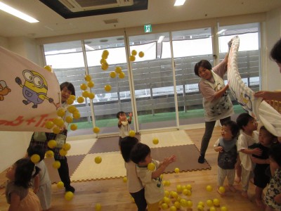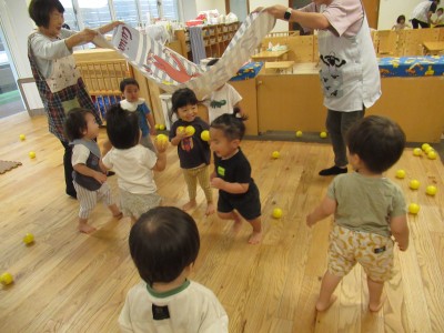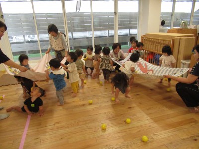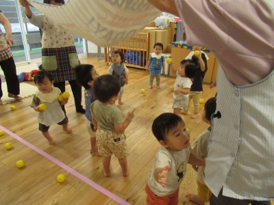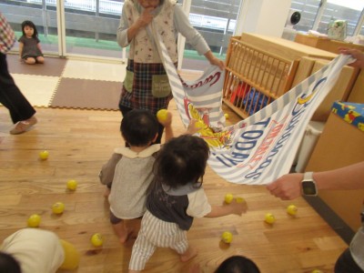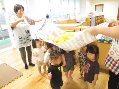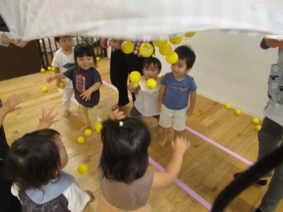 大きいタオルにいっぱいボールを入れたら・・・ボールが噴火したよ!「きゃー」とみんな叫びながらもとってもかわいい笑顔がみれました!早く噴火して欲しくて、急いでボールを集める姿、かっこよかったです(^^♪