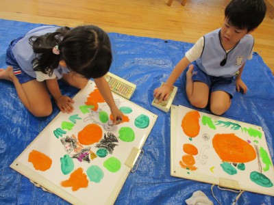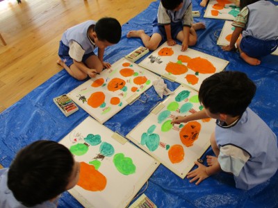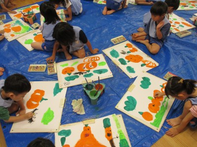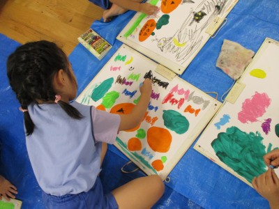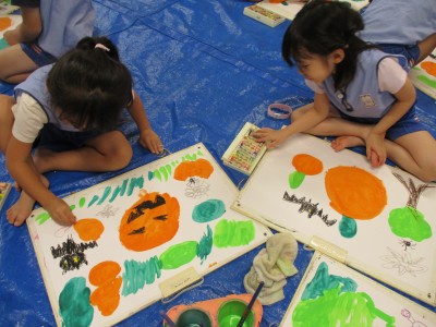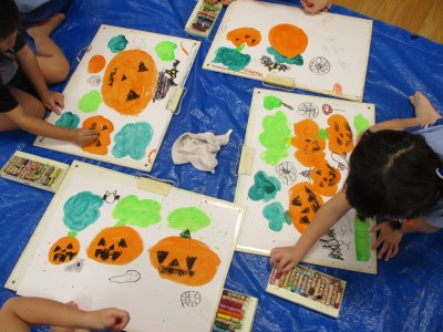 絵具でかぼちゃのおばけ、森を描き、