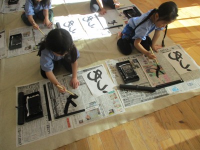 今年度の習字はこれで最後になりますので筆はお家で保管して下さい。