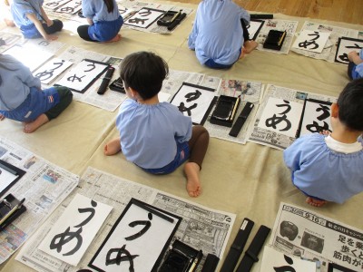 「うめ」という文字に挑戦し、「め」が少し難しかったようですが、
