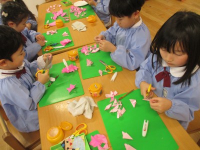 飾りは切り絵で桃の花作りに挑戦しました。