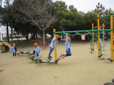 すべり台では、「カンカンカン!」「ゴー」と踏切ごっこを楽しんだよ!
