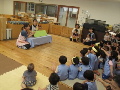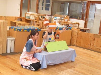 お祝いの後はみんなで「3匹のこぶた」のペープサートを見ました。