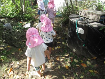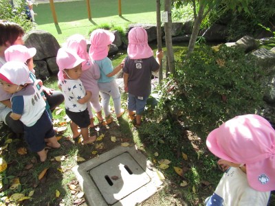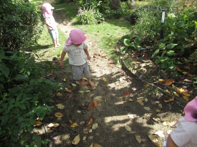 続いて・・・園庭遊び。お庭探検したよ!お花に落ち葉に虫、それから、お水、お庭探検楽しかったね(^^♪