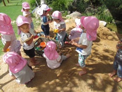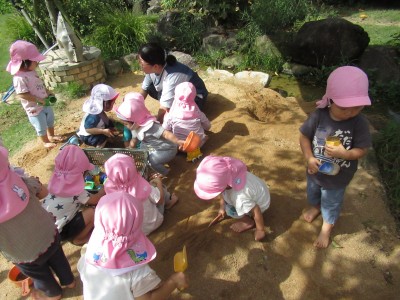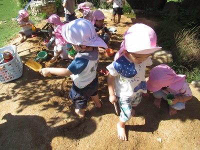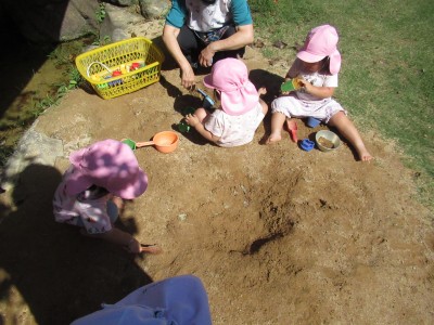最後は、お砂遊び・・・昨日の雨でお砂が柔らかくて、スコップで掘るのも簡単!型抜きも簡単!ケーキ作りに、アイスクリーム作り、いろんなものを作ったよ!楽しかったね(*^^*)