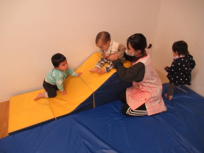 0歳児クラス今日はお部屋の中でたくさん身体を動かして遊びました♪