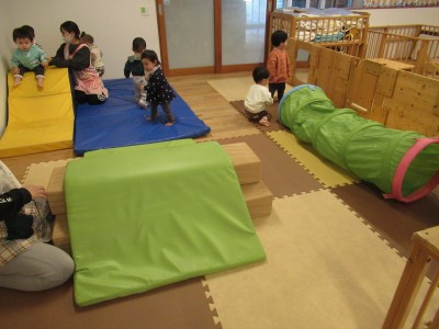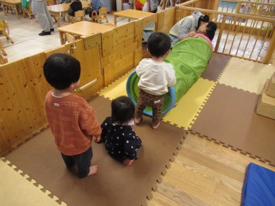 また、今までは怖くてトンネルに入ることができなかった子どもが、友達に続いて喜んでハイハイでくぐり、成長を感じることができました♡