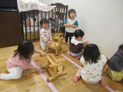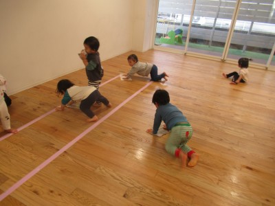 0歳児クラス今日はテラスで沢山身体を動かして遊びました(*^^*)