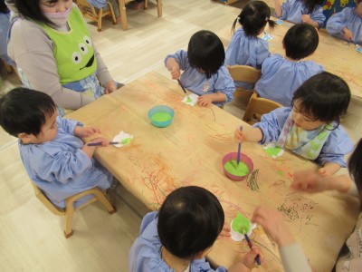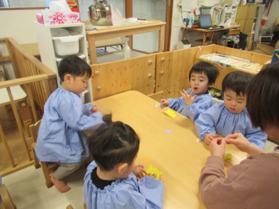 1歳児クラスお正月製作でしめ縄を作りました(*^^*)