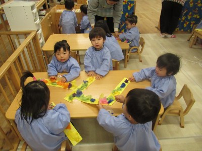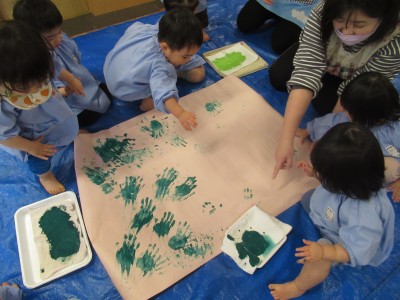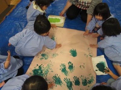 大きい紙に子ども達の手形がいっぱい!どんな作品が出来るかな?手や、足、お顔、服まで絵の具だらけ!でも子供たちのお顔は笑顔いっぱいでした(*^_^*)