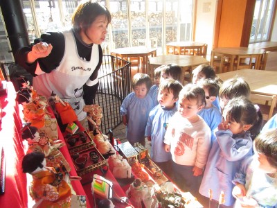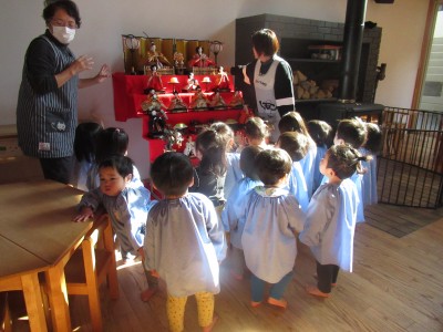 1歳児クラスランチルームに飾っているひな人形を見に行きました(*^^*)7段飾りって、大きいね!お雛様にお内裏様、三人官女に5人林、お人形がいっぱい子ども達はおひな様飾りに夢中でした(*^^*)