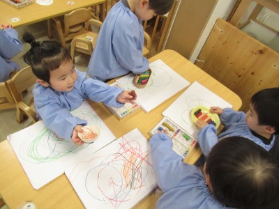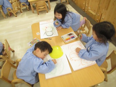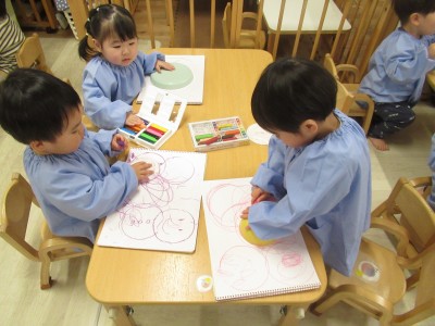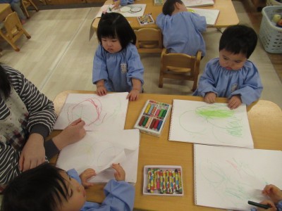 1歳児クラスお絵描き遊びの様子~クレパスでなぐり描きを楽しんだ後は、丸いお皿や四角い入れ物などを使って型なぞりをしてみました(*^_^*)ちょっと難しかったかな?手で型を押さえ一生懸命なぞっていました!「雪だるま出来た!」「丸がいっぱい!」と、楽しんでいました(^^♪