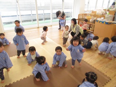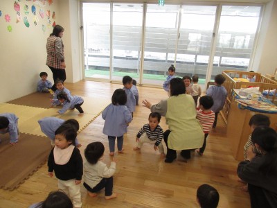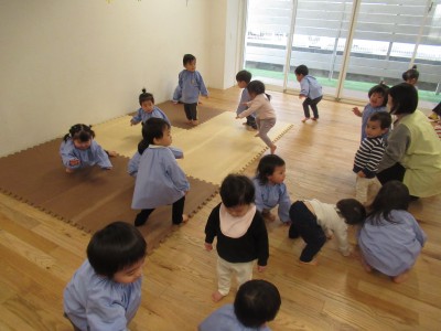 リトミック遊び~あかつき組さんと一緒にリトミック!カエルになって誰がいっぱい跳べたかな?みんながお手本になって、あかつき組のお友達も真似っこ!楽しかったね(^^♪