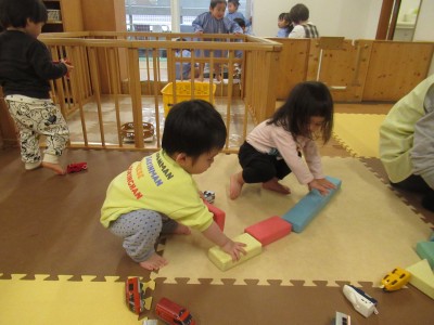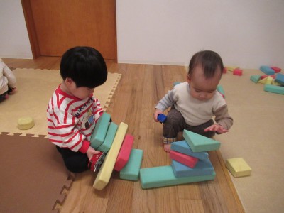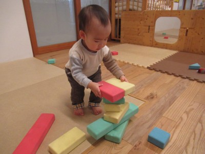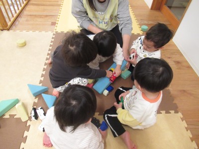 1歳児クラス昨日、みんなでブロック遊びをしました(^^♪