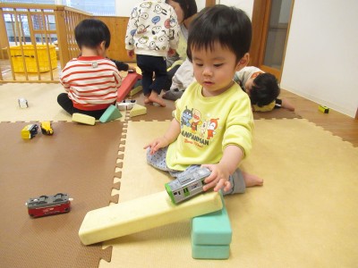 積み木を高く積んだり、並べて道路を作って走らせたりと思い思いに遊ぶ子どもたち(#^^#)