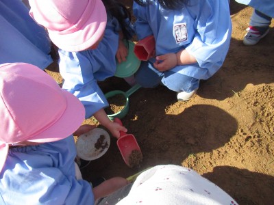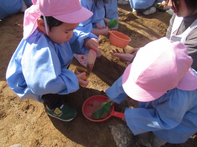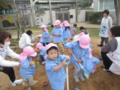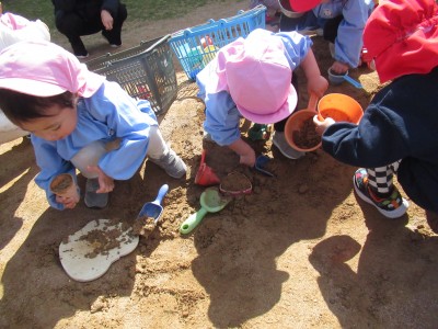 砂場遊び~今日は、久しぶりに園庭に出て遊びました!お砂場は、お友達でいっぱい!アイスクリームを作ったり、お団子を作ったり楽しかったね(^^♪