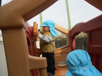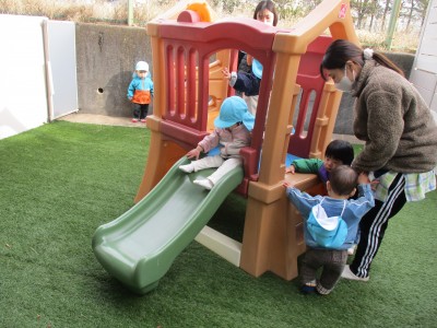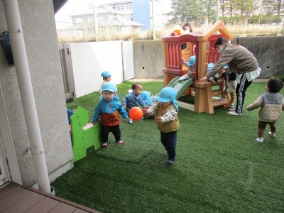 久しぶりのテラス遊びで滑り台を繰り返し滑ったり、ボールで遊んだり…