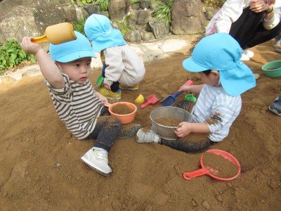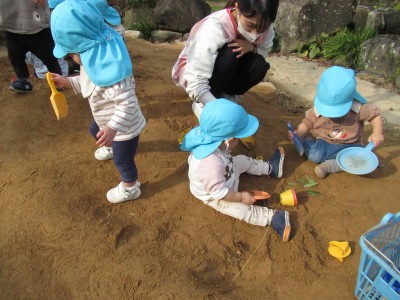 園庭ではあかつき組の貸し切りだったので、自由に探索をしたり、お砂場やキッズカーなどで遊んだりしました(^^♪