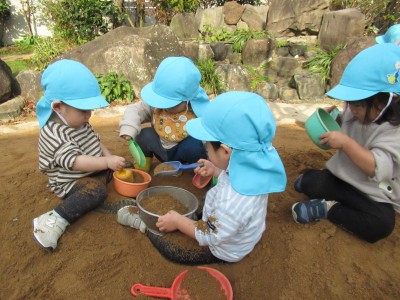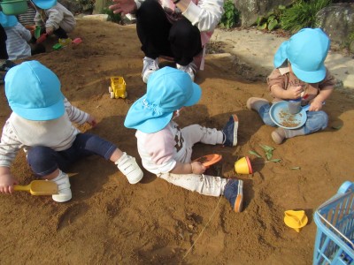 スコップを使って上手に容器に入れて食べる真似をしてみたり、葉っぱとお砂をぐるぐるとかき混ぜてみたりと遊び方も様々で、ただ砂をすくうだけではなく見立て遊びを楽しめるようになってきました✨