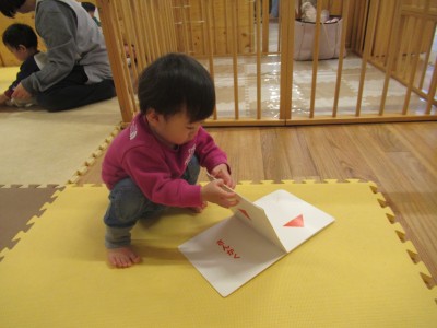 0歳児クラス今日は保育者の読み聞かせの後はそれぞれ好きな絵本を選んで自由に絵本の時間を楽しみました(*^^*)乗り物や動物、丸や三角等の形の絵本などなど、お気に入りの絵本を手に取って読んでいました。