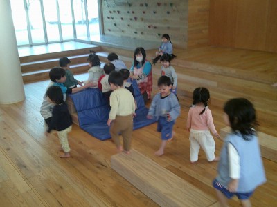 じゅうたんに、子どもたちがいっぱい!先生達も頑張って引っ張りました!