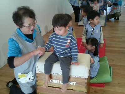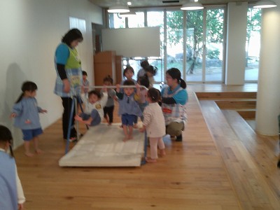 大きいタオルにいっぱいボールを入れたら・・・ボールが噴火したよ!「きゃー」とみんな叫びながらもとってもかわいい笑顔がみれました!早く噴火して欲しくて、急いでボールを集める姿、かっこよかったです(^^♪