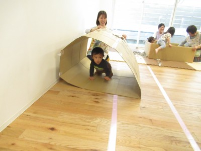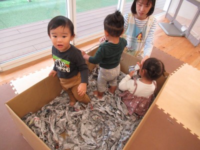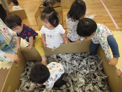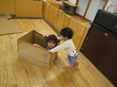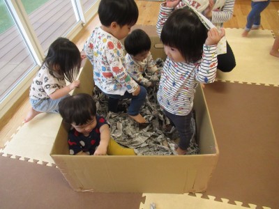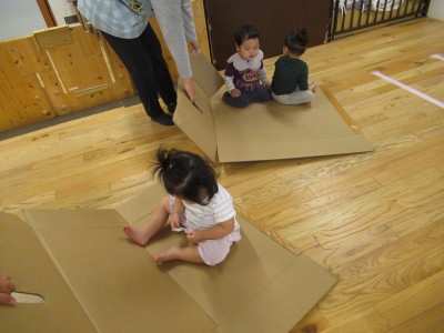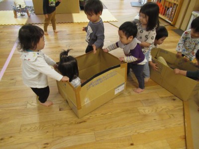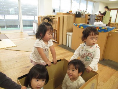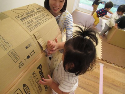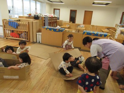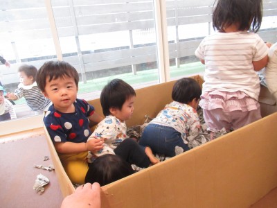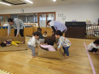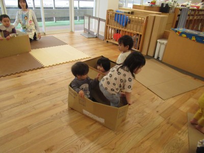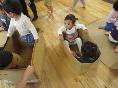続いて、段ボール車!みんなで乗ったり押したり、子どもたちの力の強さにびっくりしました(>_<)協力しながら車を押す姿、かっこよかったです!