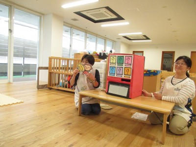 誕生日のお友達も自動販売機にお金を入れるてみると・・・なんとなんと、何が出てきたでしょうか!子ども達の聞いてみてくださいね!
