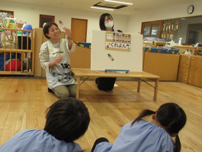 先生からの出し物は、「どんな色がすき?」と「おはようクレヨン」のペープサートでした。