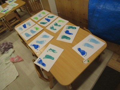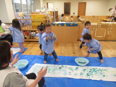 1歳児クラス足形、手形スタンプ遊びをしたよ!足形は先生と一緒に押したよ!!いろんな色の足形がいっぱいできました~