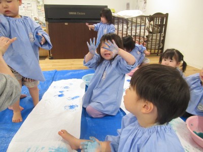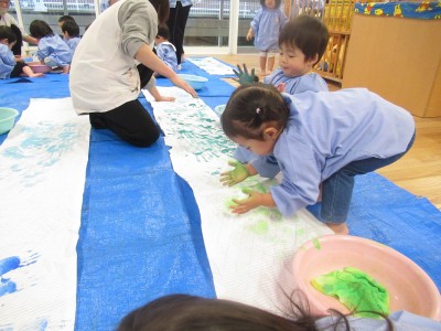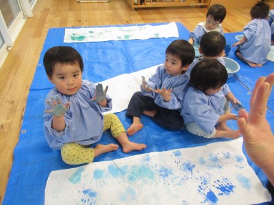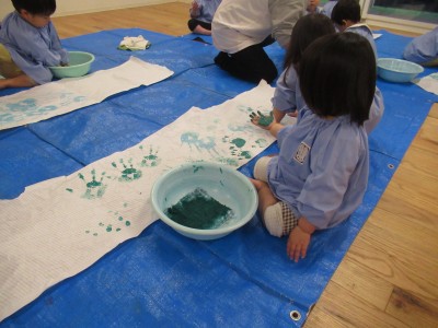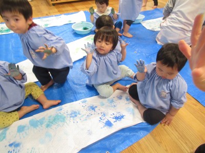 続いて・・・手形スタンプ!子ども達だけで自由に押したよ!両手いっぱいに絵の具をつけダイナミックに楽しみました(*^^*)絵の具、気持ちよかったね(>_<)