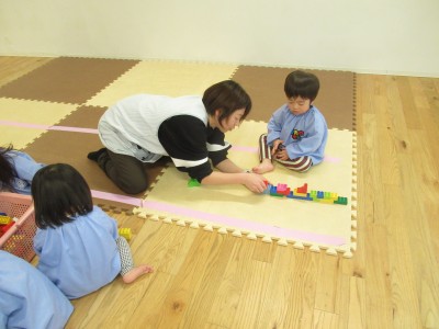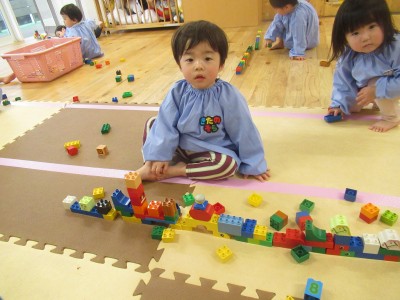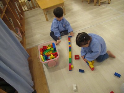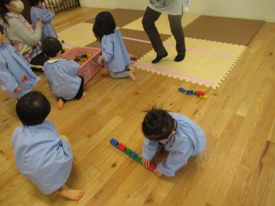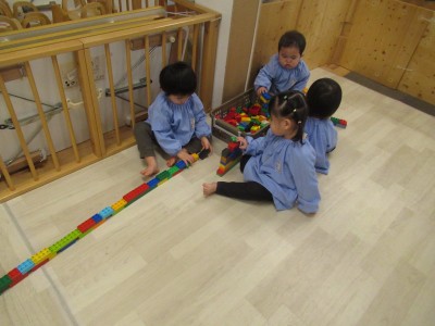 前にしののめ組のお友だちが長くブロックを繋げているのを見たあさあけ組のお友だち、最近では長くブロックをつなげて遊ぶのがブーム!