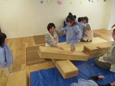 大型積み木で作った一本橋を渡ると終点はシーソー!!ちょっと怖かったかな?