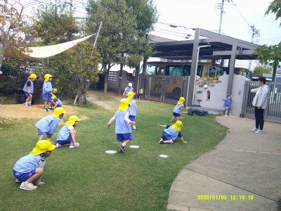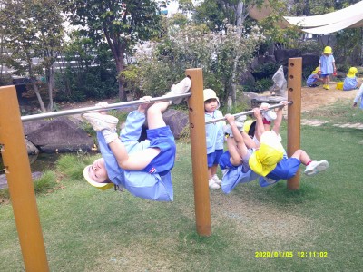 鉄棒では、ジャンプしておなかで支えて止まる「ツバメ」と横向きになって鉄棒に両足をかけてぶら下がる「ブタの丸焼き」に挑戦!そして、鉄棒を持った手の間に足を入れてそのまま回ることにもチャレンジしました!マットではみんなお得意の「おいもごろごろ」や二人で手をつないでゴロゴロ回ったりして楽しみました。いろいろなことができてみんなとっても楽しそうでした(⌒∇⌒)