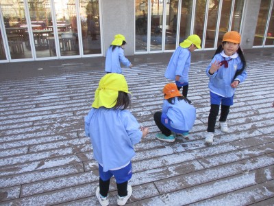 園庭に出ると大はしゃぎ!そーっと触ってみたり雪を集めてお団子を作ったり岩のところにたまっていた水が凍っているのを見つけて割ろうとしてみたりととっても楽しんでいました(^^)/