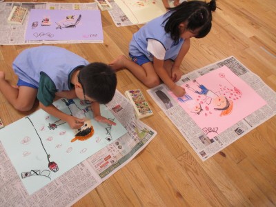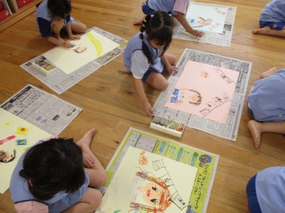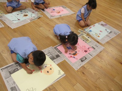 5歳児クラス1学期ジュリアン先生と一緒に作ったゴーストに色塗りをしました!