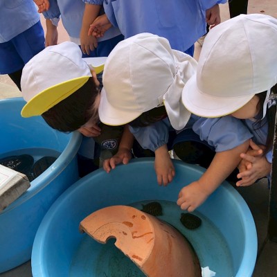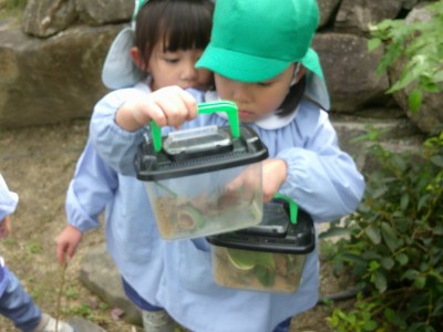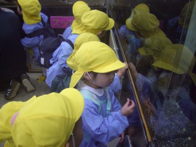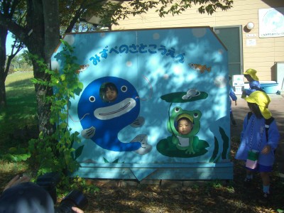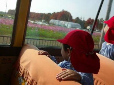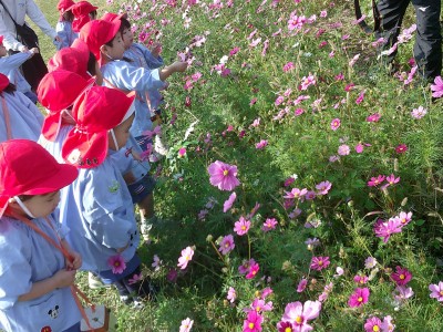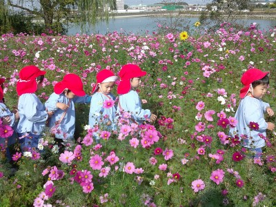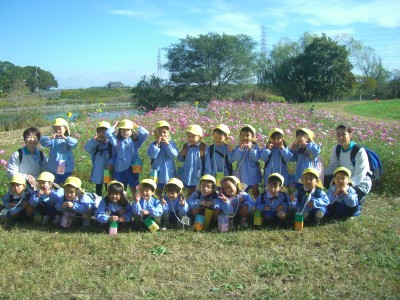 公園に着くとさっそくどんぐり発見!「せんせいみて~」とうれしそうに見せてくれました。コスモス畑でハイポーズ(^▽^)/ ”魚のおうち”で魚や亀、カエルを見ました。