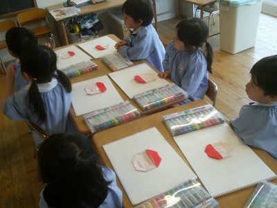 5歳児クラスひなた組のお友達が大好きな果物として多く声が上がった「いちご」を折り紙で作ってみました!