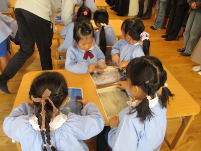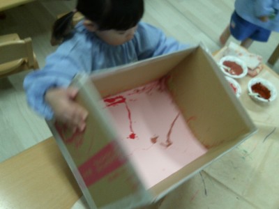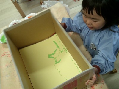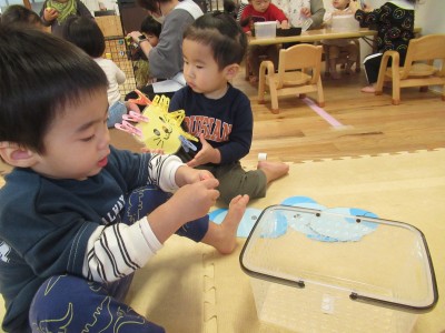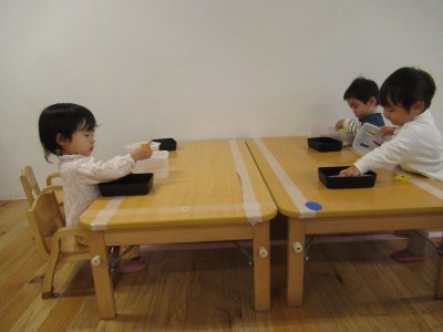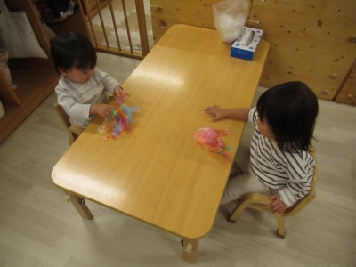 指先につけてみたり、いろんな形のブロックを合体させてみたり思い思いに楽しむあかつき組の子ども達でした(^^♪
